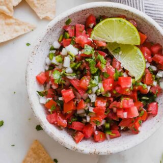 You can pretty much use Pico de Gallo on anything you like! I love it with homemade taquitos, but also with my chicken or beef fajitas, served simply with chips for a dip trio, along with my homemade avocado dip + blender salsa. You can also serve it with my chicken carnitas, or street corn chicken tacos. Plus, my homemade Pico de Gallo can be used anywhere you see fit!