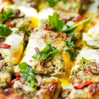 A breakfast pizza topped with sun-dried tomatoes, basil pesto, and fresh eggs. It’s perfect for pizza night or Saturday morning breakfast!
