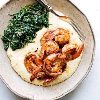 Cajun-style shrimp and grits! We’re seasoning up some large shrimp and serving them on a bed of creamy, homestyle grits with lots of sautéed garlicky kale on the side. How perfect would this be for your Sunday brunch?!