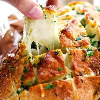 Cheesy garlic pull apart bread is the perfect interactive appetizer or centerpiece to a cheese board situation. Trust me, it’s a welcome sight if you’re serving pizza or pasta. You could even serve minestrone soup as a side dish with this bread to dip. How amazing does that sound?
