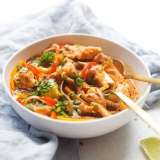 Simple 20 – minute chicken panang curry noodle bowls with veggies. Warm panang curry noodle sauce all cozied up with noodles and your favorite sautéed veggies. Perfect for chilly, weeknight dinners!