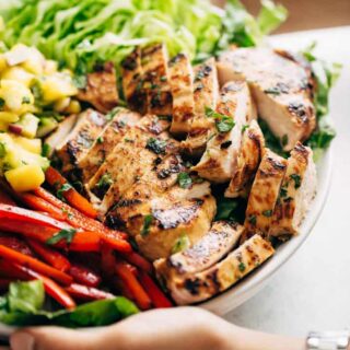 A light and healthy chili lime chicken salad with a mango and avocado salsa. We’re skipping the dressing on this salad and topping it with homemade sweet and spicy salsa. It’s the most addicting salad you’ll ever have!