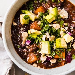 Each bowl of butternut squash chili is loaded with tender squash, fire-roasted tomatoes, tons of spices like cumin, chili powder, and all your other typical chili ingredients. Simmered in a base of stock and coffee, I’ve even added a hint of cocoa powder to this. Before you hit the little ‘x’ mark at the top of your screen – you should know this chili doesn’t taste like coffee or cocoa. These flavors are used to enhance the other flavors we’re using. And what you’re left with is a comforting bowl of squash and black bean chili that’s bursting with flavor.