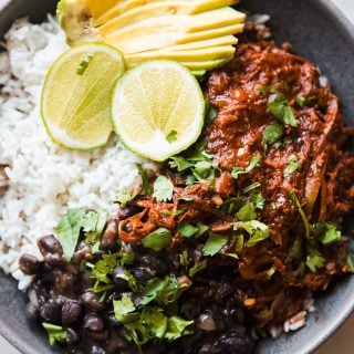 That’s it. It’s seriously the easiest dinner ever and you can start it right before you go to work and have it ready and waiting for you when you get home. Perfect, tender, and a crowd pleaser. And seriously, the comfort factor — it’s to a whole new level. I serve it on a bed of cilantro lime rice with a side of cuban-style black beans. And obvi, in 10+ years we’ve been together now, you know I need tons of chopped cilantro and lime wedges to serve on the side.