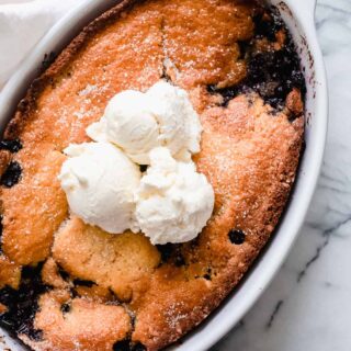 Less than ten ingredients in my homemade Texas blueberry cobbler. Texas-style cobbler has more of a cake-like texture, and you drop the fruit on top, and as it bakes, the cake rises on top. So good when it’s warm right out of the oven topped with vanilla ice cream!