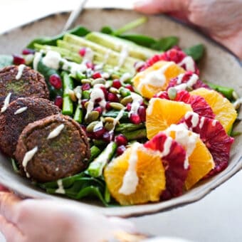 Okay, i’m sorry. Did I sound a little too happy about Monday? Because that’s totally not how I feel about them. But I DO feel completely the opposite way about this falafel veggie salad that’s decked out with blood oranges, pomegranate arils and a handful of pepita seeds — it’s feel good, look good, ??? food.