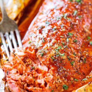 The best way to eat baked salmon in foil — glazed with Firecracker sauce! This recipe is so easy to make and pulls together in less than 30 minutes. Salmon is always so flakey and tender when you bake it in foil!