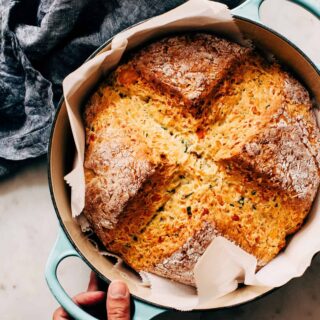 A new spin on Irish soda bread! My Cheddar chive soda bread is flavored with garlic, tons of Irish cheddar, and freshly chopped chives. Serve it with a smear of butter or with a bowl of stew!