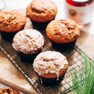 - icing: in a small bowl, whisk together 1 cup of confectioners (powdered) sugar + 1 tablespoon maple syrup + 1/2 teaspoon vanilla extract and 1-2 tablespoons of milk. Dip the tops of the muffins in the prepared glaze. Let harden about 20 minutes on a baking rack.