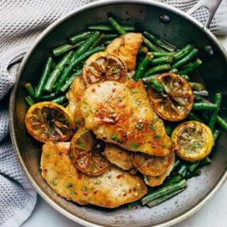 - Assemble: Add a small drizzle of oil to the pan you cooked the chicken in if it needs it. Add the lemon slices and push them around the pan with tongs to pick up all the bits left behind by the chicken. Add the green beans and sauté them for 3-5 minutes or until done to preference. Season with salt, pepper, and the remaining 1/4 teaspoon of garlic powder. Pile the chicken onto the skillet if you'd like or divide into personal servings. You can drizzle the sauce over the entire dish or serve it on the side. Personally, we like it on the side (drizzled over rice) so the chicken keeps that nice sear!
