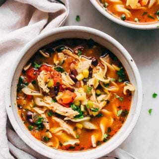 It’s roughly a southwestern chicken noodle soup so swap and use whatever it is that you like. Really, make it your own, you won’t hurt my feelings!