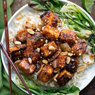 - SERVE: Serve warm with rice, quinoa, or on it's own. Top with crushed peanuts, red pepper flakes and lime wedges. Serve with grilled bok choy is desired. The tofu will lose a bit of the crispness as it sits. But the flavors intensify and the stir fry tastes even better the next day!