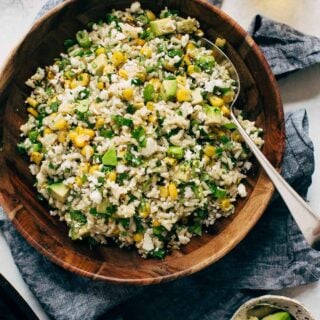 And you bet this street corn rice salad is going on the menu of EVERY backyard barbecue party we host. Not only is this salad loaded with tons of good stuff, but it’s also lighter in the calories department. And to top it off, it pairs wonderfully with grilled chicken or beef. I’d stuff it in tortillas with my steak fajitas or serve it alongside ancho chili street tacos or even the blackened salmon tacos. Honestly, this would go with just about anything!