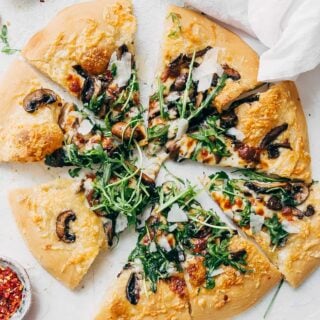 – truffle oil: We’re using white truffle oil to flavor our pizza with that earthy, bold and delicious aroma. All you need is a tablespoon for the crust a drizzle on top if you’d like. If you can’t find white truffle oil in your local grocery store, you can also purchase it here. Keep in mind that a little goes a long way so don’t go too crazy with this stuff. With the leftover truffle oil, you can use it to flavor just about anything, pasta, soups, and other pizzas.