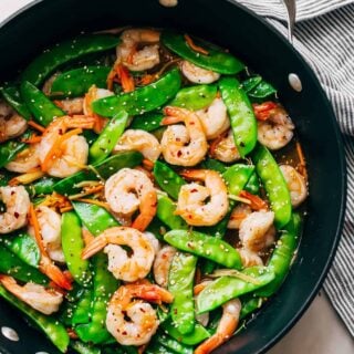 A quick and easy shrimp snow pea stir fry recipe that you can put together in 10 minutes! This is the perfect thing to make for dinner when you’re running short on time. Plus, there’s hardly any chopping involved!