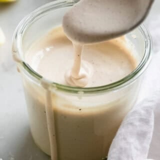 - Place all the ingredients in a mason jar and using an immersion stick blender, just blend the ingredients together until the dressing emulsifies. Alternately, you can add all the ingredients to a blender and blend until smooth. Taste, and adjust with additional lemon juice, salt, or pepper. If the dressing is too thick, add a tablespoon of water at a time until it reaches desired consistency.