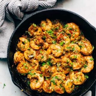 First, picture this: spicy sauteed tomato paste flavored with fresh ginger and garlic paste, followed by coriander and cumin (because what Indian recipe is complete without it,) and finally tons of freshly squeezed lemon juice and chopped cilantro. So to sum it all up, it’s all the flavors you LOVE from Indian food that come together in this spicy shrimp masala.