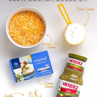 - Add cream cheese, salsa verde, sour cream, garlic, and cheddar jack cheese into the slow cooker. Allow the dip to cook on the low setting for 2.5 hours, stirring every 30-45 minutes. Use a small whisk to help remove any lumps. Serve warm with pretzels, tortillas, veggie chips, veggie sticks, and pita chips.