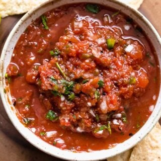 The quickest, most delicious blender salsa recipe ever. This salsa takes just 5 minutes to whip up. Just add tomatoes, jalapeno, and a few other ingredients into the blend and blend! Serve it with chips or use it anywhere salsa is called for!