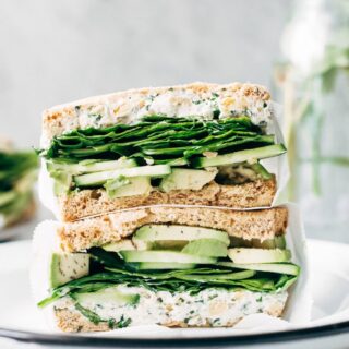 What to expect? Creamy garlic and herb spread speckled with chickpeas and tons of buttery avocados, crunchy cucumbers, and tender baby spinach loaded between two slices of pillow-soft bread.