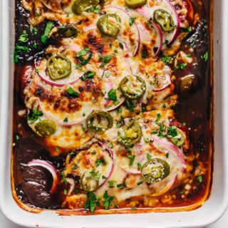 - BAKE: the chicken for 20 minutes, uncovered. Remove the chicken from the oven. Add the shredded cheese over the chicken breasts, sprinkle with red onions and jalapeños. Place the baking dish back in the oven and continue baking for another 5-10 minutes or until the cheese melts and the chicken cooks all the way through. Using an instant read thermometer, make sure the chicken temperature reads 165ºF. If it doesn’t, continue cooking for an additional 1-5 minutes.