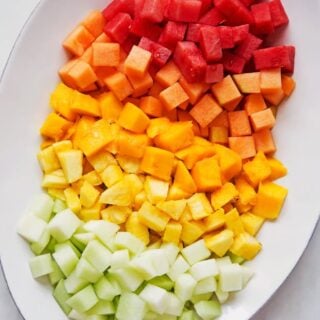 A simple Mexican fruit salad that’s spiced up! I toss my favorites – watermelon, honeydew, pineapple, cantaloupe and of course, mangoes in a light honey-lime and chili flavored dressing! This is the perfect refreshing and healthy treat for all your summer gatherings!