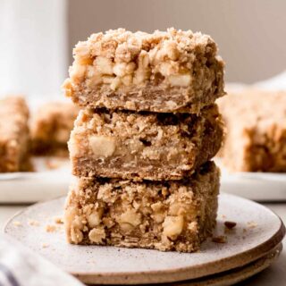 Hope you enjoy them, Mel! I do suggest refrigerating them as the apples hold up better that way. If you prefer the crumble bars at room temp or warm, you could always reheat them for a few minutes in a toaster oven! 🙂