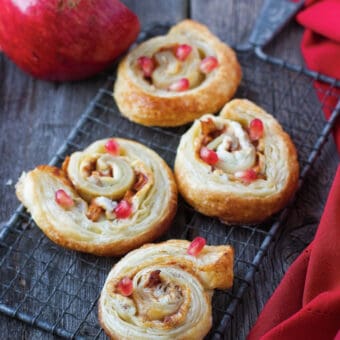 The end of the year is both a little sad and a little exciting for me. I have such mixed feelings for the New Year! But there is one thing I’m definitely looking forward to in the new year. And it’s munching on these puff pastry pinwheels. These appetizers are such a treat! Buttery puff pastry rolled up like palmiers with goat cheese and chunks of apple cinnamon. They’re both slightly sweet and savory. I find sweet + savory things are the most addicting. Don’t you?
