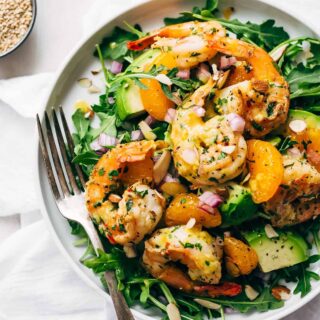 Avocado shrimp salad topped with homemade citrus miso dressing is what summer is all about! This salad is loaded with peppery arugula, tons of avocado slices, juicy mandarin oranges, and garlic butter sauteed shrimp!