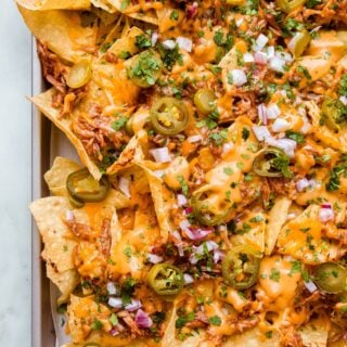 BBQ chicken nachos are my favorite pizza toppings turned into an easy sheet pan snack or meal! Crispy tortilla chips topped with bbq shredded chicken, cheddar cheese, onions, pickled jalapeños, and so much more!