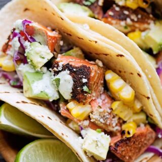 Blackened Salmon Tacos topped with diced avocados, fresh grilled corn, cotija cheese, and homemade jalapeño lime crema! These are the best salmon tacos you’ll ever have and they are so simple to make!