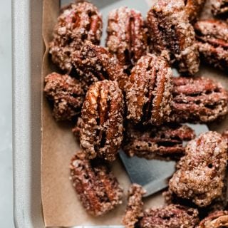 Other ways to serve candied pecans? Toss on a candied sweet potato casserole for a little added crunch or do what I do, eat them by the fistful 😉