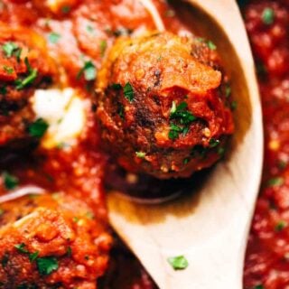 Serve with spaghetti for Sunday night supper and when I’m single on the weekdays they’re great in meatball sub with marinara sauce to dip them in or with the world best garlic bread and an house salad. Really, is there a wrong way to eat a meatball?
