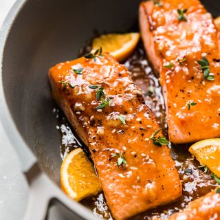 Citrus Glazed Salmon is the dish you need to make to impress your family and friends without breaking a sweat! It’s basically crispy pan-seared salmon fillets glistening with a quick citrus glaze that’s sweet, spicy, and with a hint of tang. The glaze is so simple that it comes together in a measuring cup and simmers in the same skillet we cook the salmon in.