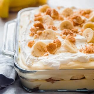 Typically a banana pudding is served in a clear trifle bowl or any glass dish so that you can see all the layers. Sometimes I’ll use 2-8×8 dishes or even personal sherbet bowls!