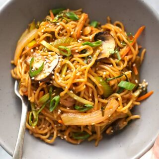- Veggies – I like to use mushrooms (i’ve used shitaki and baby bellas both are DELISH), bok choy, scallions, sliced onions, coleslaw style shredded cabbage, matchstick carrots, and my all time favorite lo mein veggie – celery! But you could definitely use broccoli, zucchini, spinach (if you don’t mind that sort of thing), corn, bell peppers, green beans, and anything else you don’t mind twirling with noodles that are glistening with homemade lo mein sauce!