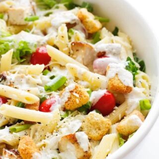 This creamy chicken caesar pasta salad makes for an easy dinner and the leftovers are even better for lunch the next day! Bring it to your next potluck or picnic and watch them line up for the recipe!