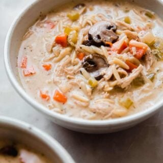 A comforting creamy chicken mushroom soup with orzo pasta! This meal comes together quickly with cooked shredded chicken, tender veggies, buttered mushrooms, orzo pasta, all in an ultra comforting creamy broth base. So good it’s sure to be a family fave!