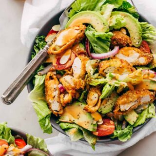 Learn how to make a crispy chicken salad that’s drizzled with sriracha honey bbq dressing! The chicken tenders are perfectly juicy and tender on the inside with that crispy panko crust on the outside. You’ll love this easy crispy chicken salad!