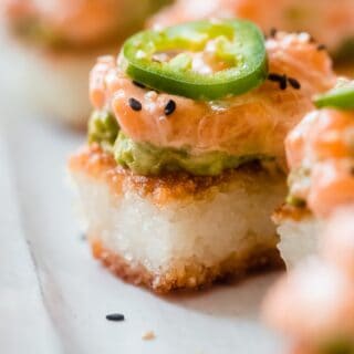 Crispy Rice Spicy Salmon recipe is the perfect two-bite appetizer or main course. Pan-fried sushi rice cakes topped with smashed avocado and spicy salmon, so easy and so delicious!