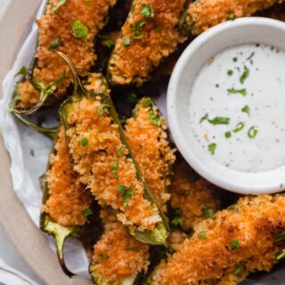 Tender jalapeños filled with a creamy buffalo chicken mixture topped with crunchy seasoned panko. That first bite has it all. A little heat, lots of creaminess to cool it down, and loads of crunch! We love making a large batch of these and serving them to friends and family when they come over with a big bowl of ranch dressing on the side.