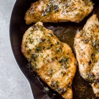 If you don’t have an ovenproof skillet, transfer the seared chicken breasts into an oven-safe baking dish. Then pour the garlic butter on top and bake in the oven as listed. Keep in mind that it may take a few minutes longer to cook the chicken since you’re starting in a cold baking dish. By baking it in the same skillet we seared the chicken in, we get a bit of a head start.