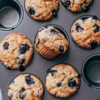 One thing I like to do before folding the blueberries into the batter is wash them, and toss them in a tablespoon of flour. This helps keep the blueberries from sinking to the bottom of the muffin.