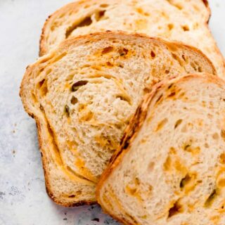 What I love about making homemade jalapeño cheddar bread is that it comes together rather quickly for a yeast bread recipe. In just a little over 3 hours, you’ve got perfect sandwich bread that’s good to eat warm from the oven. Keep in mind it’s like 15 minutes of hands-on time and everything else is just proof/bake time.