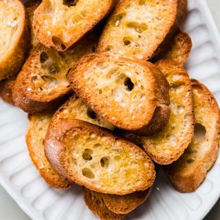 Learn how to make crostini at home with this simple, 3-ingredient recipe! These crisp, golden little toasts are perfect to serve alongside your favorite party dips, appetizers, or on a cheeseboard!