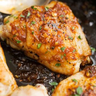And yes, these honey garlic chicken thighs are just as addicting as that show. And the best part — there are no special skills required! It’s as easy as browning the chicken in a skillet be it on the stove OR in the oven! I’m giving you directions for both because though it might be cool enough to start up that oven up north, down in the south here we just had a high of 90! Next, we use the pan drippings to make a sweet and tangy sauce that would be perfect to serve over white or brown rice with steamed broccoli as a side.