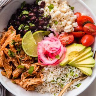 One night a week, I’ll make us bowls. You know, where you make the protein, grab the rice or quinoa from the fridge, and top it with things like sliced carrots, cucumbers, or quick-pickled onions and call it a meal. Before these Chicken Tinga bowls, we had salmon sushi bowls weekly. Bowls like these are a sensation for your mouth and eyes. Color, texture, and tons of sweet, spicy, creamy, and pickled elements come together in harmony. But hold the phone – I haven’t told you the best part!