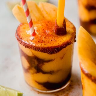 A Mangonada is a traditional Mexican blended beverage that’s sweet, spicy and tangy! Each sip consists of a sweet mango base with layers of salty and spicy Chamoy and Tajin seasoning. Mangonada is also known as Raspado, Chamoyada, and Chamango!