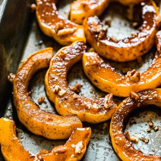 There are so many ways to serve roasted squash. These slices are a great addition to a hearty autumn salad bowl. Make a salad with tons of nuts, goat cheese, and a drizzle of creamy balsamic dressing. It works beautifully as a side with roasted chicken, and some sprouts, and it is a great alternative to a butternut squash or acorn squash if you just want to change it up once in a while!