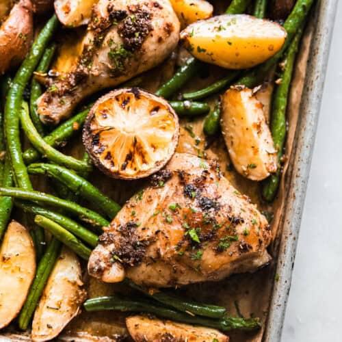 Made this tonight with chicken thighs and it turned out perfect! It all cooked within 30 minutes, although I did slice up the red potatoes into small pieces (1/8ths). I wish I had used a sheet with a larger rim though since there was a good bit of juice at the bottom from the chicken and melter butter. I also had to roast the green beans in a separate pan because there wasn’t enough room. Overall it was a hit though!
